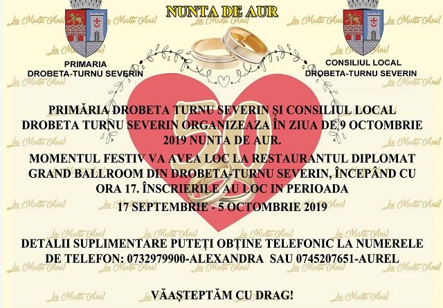 Eveniment de amploare, organizat de Primăria și Consiliul Local Drobeta Turnu-Severin! Prin intermediul acestei activități, intitulate sugestiv ’’Nunta de aur’’, organizatorii își propun să adune, într-un cadru festiv, cât mai multe cupluri, care au împlinit 50 de ani de căsnicie!